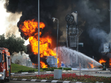 An Israeli firefighter tries to extinguish a petrol station on fire after it was hit by a rocket fired from Gaza in Ashdod, Israel, Friday, July 11, 2014.