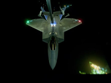 A US Air Force KC-10 Extender refuels an F-22 Raptor fighter aircraft. (Associated Press)