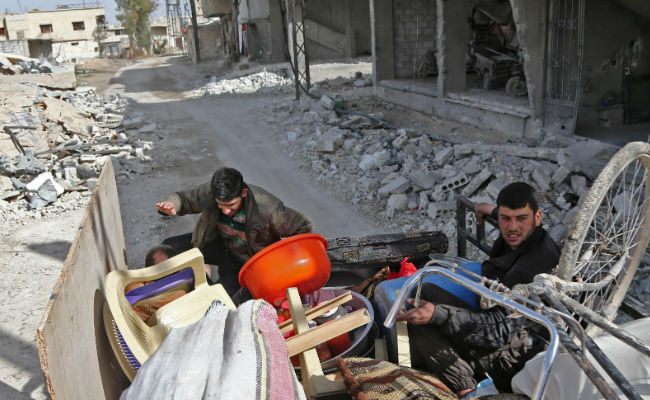 Syrians pack their belongings as they flee their home in Eastern Ghouta
