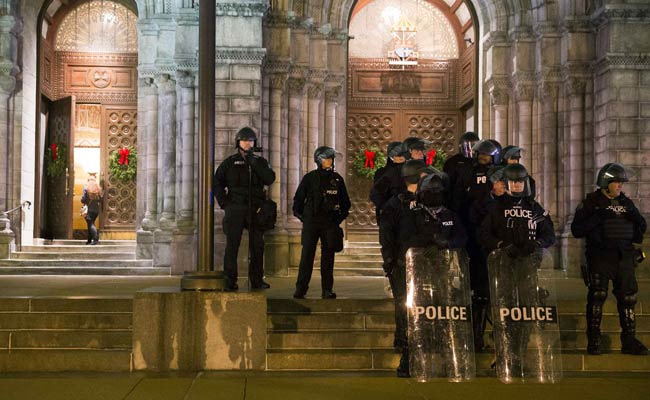 Police stand guard during a protest at Cathedral Basilica. (Reuters)