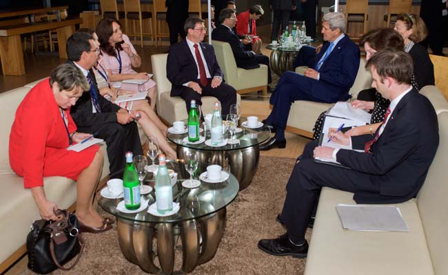 The US State Department's Twitter account published a picture of US Secretary of State John Kerry and Cuban counterpart Bruno Rodriguez looking at the camera with straight faces as they shake hands, on the eve of the Summit of the Americas.