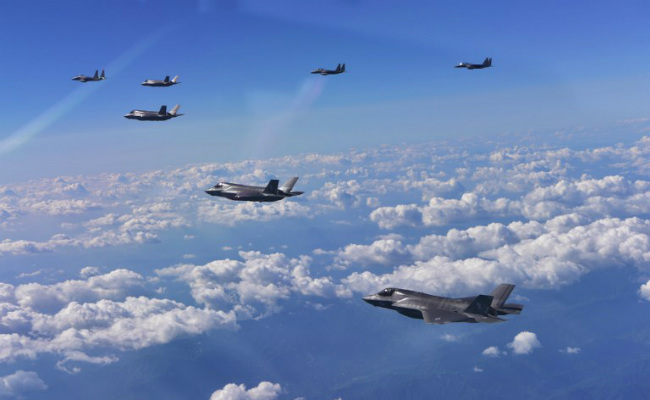 South Korean F-15K fighter jets and US F-35B stealth jets in a drill. (AFP/South Korean Defence Ministry)