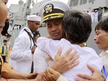 US navy officer Michael "Vannak Khem" Misiewicz embraces his aunt Samrith Sokha at Cambodian coastal international see port of Sihanoukville.