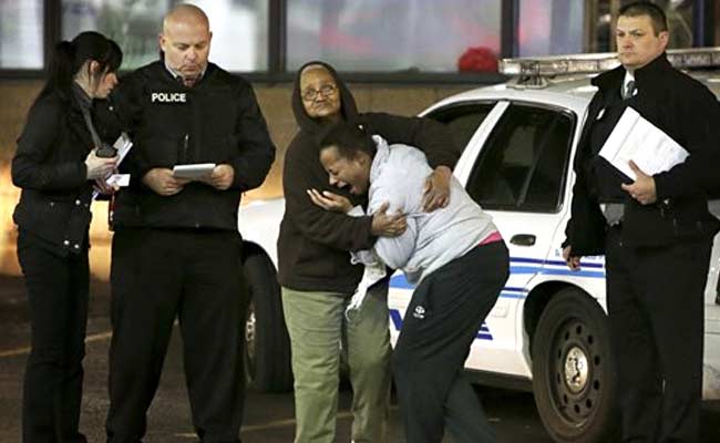 Toni Martin, front center, cries out on as she talks to police at the scene where she says her son was fatally at a gas station in Berkeley. (Associated Press)