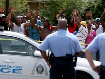 People raise their arms while chanting, "Hands up, Don't Shoot", as they stand nearby to where St. Louis police say officers shot and killed a 23-year-old man who was wielding a knife and refused to drop it on August 19, 2014 in St Louis, Missouri.