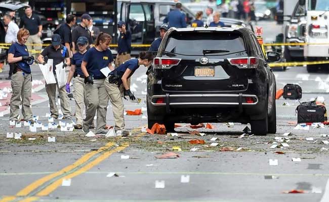 FBI officials label and collect evidence near the site of an explosion in New York's Manhattan.