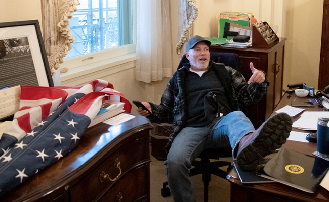 Richard Barnett, 63, was leaning back in a chair with his boots propped up on a desk in the office of the Democratic politician when he had his picture taken by an AFP photographer.
