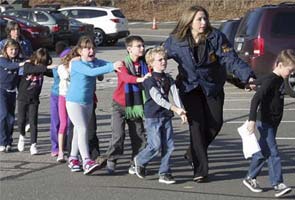 "A photo posted by The Newtown Bee newspaper showed a group of young students - some crying, others looking visibly frightened - being escorted by adults through a parking lot in a line, hands on each other's shoulders.