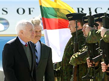 US Senators John McCain (R) and John Hoeven (L) arrive at the US Air Force, currently deployed on NATO’s Baltic Air Policing mission, near Siauliai Zuokniai, Lithunaia.