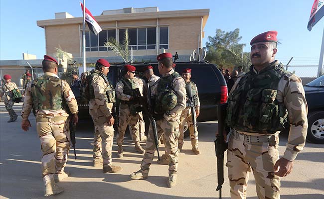 Iraqi army soldiers stand before a conference on fighting the Islamic State group at the Al-Asad air base, in Iraq's mainly Sunni Anbar province, on November 11, 2014.