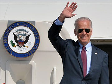 US Vice President Joe Biden waves after landing at the Boryspil airport in Kiev on April 21, 21014