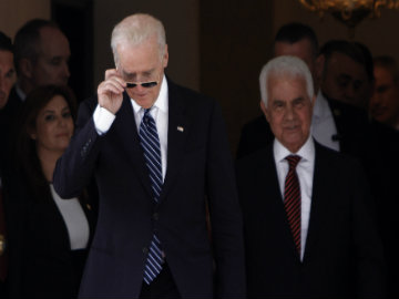 US Vice President Joe Biden, left, adjust his sunglasses as his leaves a meeting with the Turkish Cypriot leader Dervis Eroglu, right, in the Turkish Cypriot breakaway north of divided capital Nicosia, Thursday, May 22, 2014.
