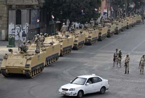 Egyptian army soldiers take their positions on top and next to their armored vehicles to guard an entrance of Tahrir Square, in Cairo