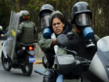Venezuelan National Guard members arrest an anti-government activist during a protest in the capital city of Caracas