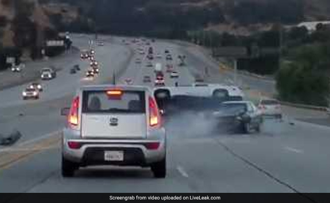 Sparks or flames shoot up from the left front wheel of the sedan, which then spins back across the lanes of traffic into a white pickup, which flips over.