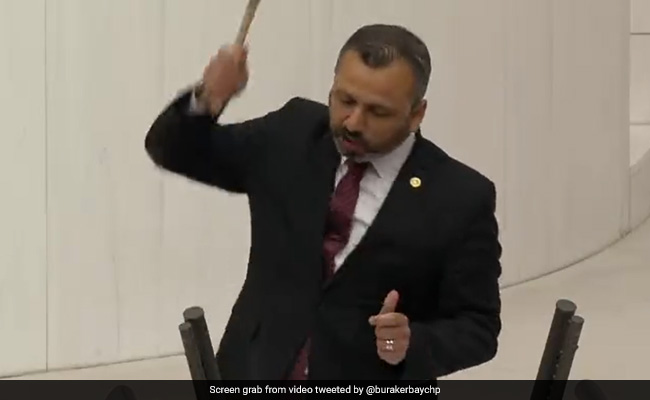 A Turkish politician, Burak Erbay, destroyed a phone with a hammer in parliament on Thursday to show his opposition to new disinformation and social media legislation, according to the news agency Reuters.