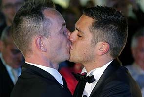The two men, in matching tuxedos, embraced to Frank Sinatra singing "Love and Marriage" and spoke of how it would help them start a family - new legal rights that hundreds of thousands protested against, some violently, right up until this week.