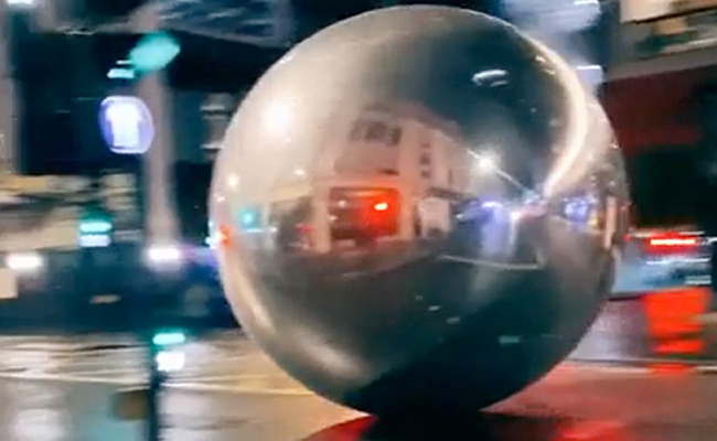 The clip was shot outside Centre Point and it shows the huge mirrored bauble hitting a lamppost and causing it to shed its glittery skin. Moments later, the ball gets lifted into the air by high winds. In the video, cars were seen dodging the oversized balls as they tumble uncontrollably.