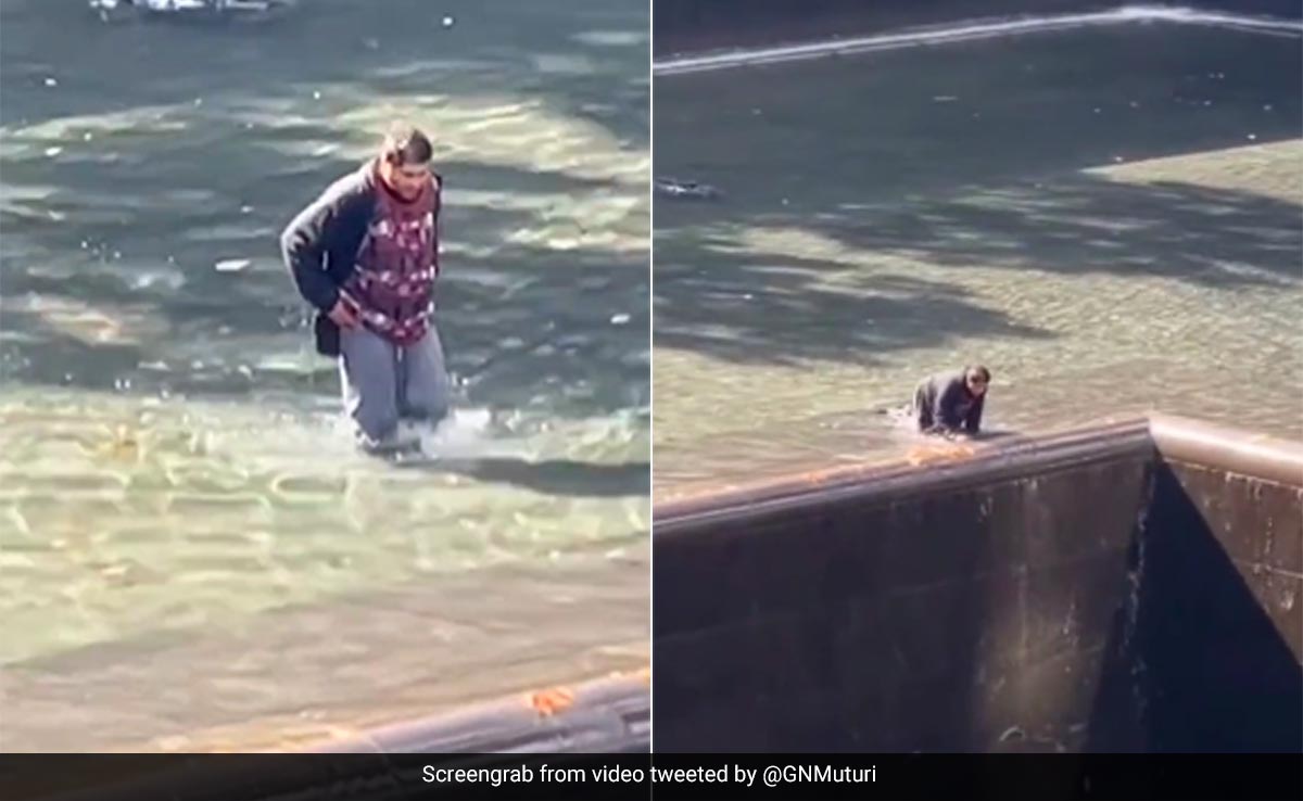 In a video of the incident that has gone viral, the man was seen lying in the 18-inch deep water in the pool's central basin after walking slowly towards it. He then slowly moved closer to the center and slid head-first into the pool. The man injured his leg and back in the incident and was taken to the hospital for non-life-threatening injuries.