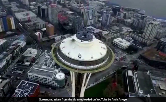 Video given to CNN by Space Needle management, and taken from the device, shows the drone hovering around the observation deck before it careens onto a platform near the bottom of a holiday light display. A few people were working on the platform at the time. The building, which tops out at 605 feet with the spire, was not damaged.