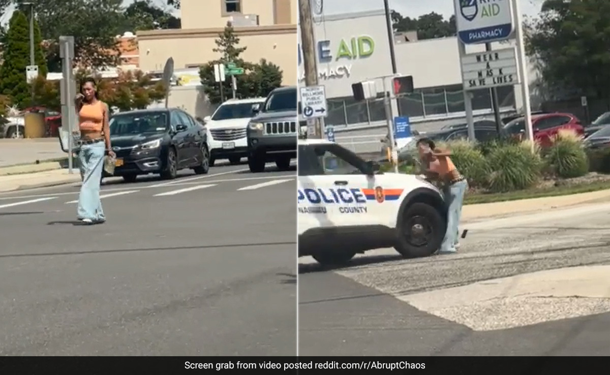 A disturbing video going viral on social media shows a woman in the US waving a gun and pointing it at traffic in the middle of a busy intersection. Walking backwards, she turns the gun on herself just before a police car rams her knocking her to the ground. According to NBC New York, the incident took place in Nassau County on Tuesday afternoon (local time). The police said that the 33-year-old woman is being treated for minor injuries. They have not released her name.