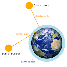 But when the Sun is closer to the horizon, the path is less direct. This means that during sunrises and sunsets, sunlight travels through more of Earth's atmosphere. And more atmosphere means more scattering.