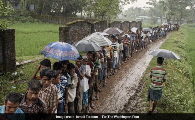 Rohingya refugees wait in the rain to get food rations from the Bangladeshi local charities