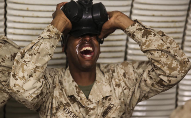 Military recruits enter the chamber one by one and don protective masks. Tear gas swirls. Then, the order: Take off your mask and breathe. Eyes well and throats tighten, and men and women training for war uncontrollably gag.
