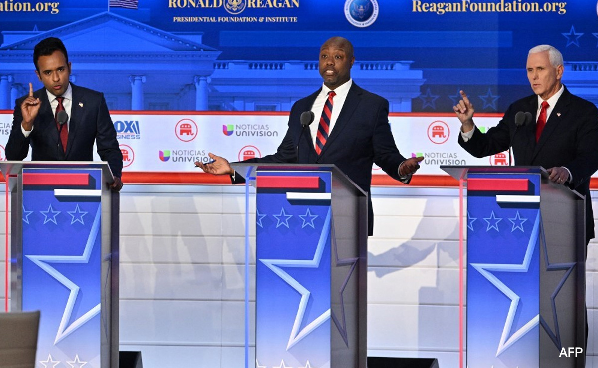 South Carolina Senator Tim Scott and North Dakota Governor Doug Burgum rounded out the field for the clash at the Ronald Reagan Presidential Foundation and Institute in Simi Valley, California, moderated by Fox Business and Univision.
