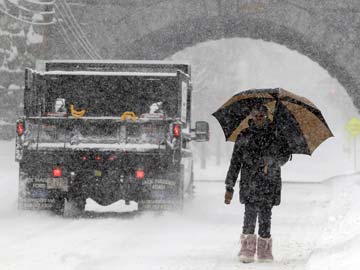 Trishia Williams, of Norwood, Massachusetts, uses an umbrella while making her way to work on a snowy road.