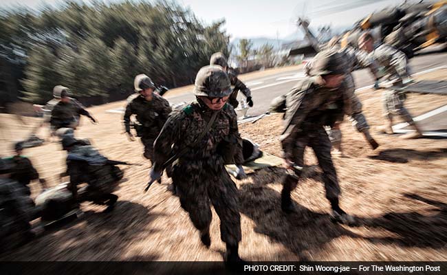 Wounded soldiers evacuation training is shown on March 15, 2016 in Osan Air Base, Osan, South Korea. (Photo by Shin Woong-jae for the Washington Post)