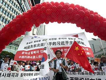 A conservative activist holds a South Korean and Chinese national flag during a rally welcoming Chinese President Xi Jinping's visit to South Korea, near the Chinese Embassy in Seoul, South Korea, Wednesday, July 2, 2014.