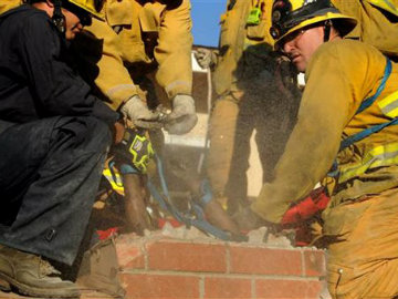 Firefighters work to free Genoveva Nunez-Figueroa, 30, from a chimney. (Associated Press)