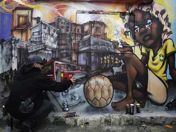 Brazilian artist Bone, a member of OPNI, puts the final touches to his graffiti on a wall, in reference to the 2014 World Cup, in the Vila Flavia slum of Sao Paulo May 28, 2014.