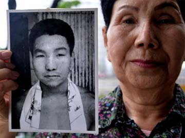 This file picture taken on May 20, 2013 shows Hideko Hakamada, sister of Iwao Hakamada, holding a picture of her young brother Iwao during an interview outside the Tokyo Detention House in Tokyo