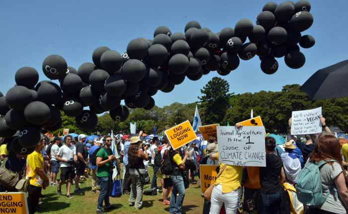 Black balloons float in the air during a rally calling for action on climate change in Sydney on November 29, 2015. (Agence France-Presse)