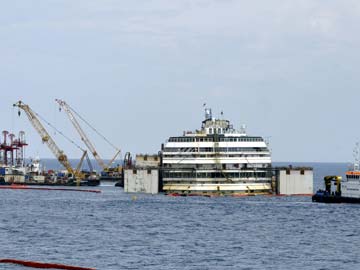 In this picture Costa Concordia is seen as it moves away from the underwater platform where it laid, during operations to put it afloat, on the tiny Tuscan island of Giglio, Italy, on July 14
