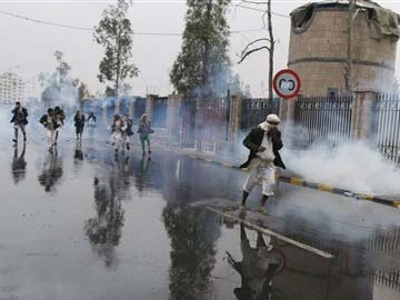 Yemeni Shiite protesters run from tear gas fired by riot police during clashes in Sanaa, September 7. (Associated Press)
